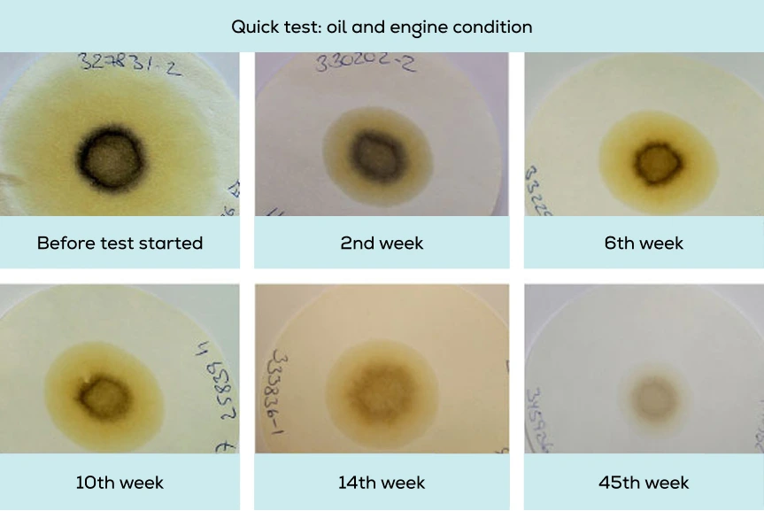 The quick test shows that the lubricating oil was heavily contaminated with dust, metal abrasion, and other particles before and at the beginning of the test period. Oil aging signs and high water content were detected. Thermal load on so-called hot spots (e.g. bearings) and particles from component wear (copper, iron, aluminum) accelerate the degradation of the base oil as well as of the additives and thus the oil aging process.